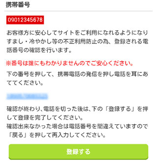 先ほど入力した携帯番号から、画面に表示された番号に電話をする認証方法です。