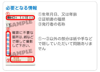 下の画像のように生年月日・証明書の種類・発行者名の3箇所を写るように撮影します。